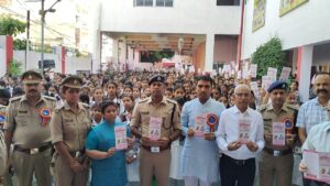 उ०प्र०शासन की मंशा के अनुरूप बालिकाओं एवं महिलाओं की सुरक्षा एवं स्वावलंबन हेतु चलाए जा रहे मिशन शक्ति के विशेष अभियान (फेज-04) त्यौहार दुर्गा पूजा/दशहरा के दृष्टिगत चलाए जा रहे मिशन शक्ति फेज-4 व ‘शक्ति दीदी’ अभियान के अंतर्गत महिला सशक्तिकरण रैली के अंतर्गत आज दिनांक 18.10.2023 को पुलिस अधीक्षक खीरी गणेश प्रसाद साहा द्वारा कोतवाली सदर क्षेत्रान्तर्गत ‘सरस्वती विद्या मंदिर बालिका इंटर कॉलेज’ की छात्राओं को शासन द्वारा संचालित महिला सुरक्षा संबंधित विभिन्न हेल्पलाइन नंबरों के बारे में जागरुक करने के साथ-साथ साइबर अपराध व विभिन्न योजनाओं के प्रति जागरुक किया गया इसके साथ ही जनपद खीरी में मिशन शक्ति फेज-04 अभियान के अंतर्गत महिला सशक्तिकरण रैली में ‘चुप्पी तोड़ो, खुल कर बोलो’ का संदेश लेकर महिलाओं/बालिकाओं/छात्राओं को नारी सुरक्षा, नारी स्वावलंबन एवं नारी सम्मान की दिशा में जनपद की महिला बीट पुलिसकर्मियों द्वारा अपने-अपने बीट क्षेत्र/ग्राम पंचायत/वार्ड/मोहल्लों के पूजा पंडालों में पी0ए0 सीस्टम/एल0सी0डी/जिंगल गीत के माध्यम से जाकर प्रतिदिन लघु फिल्म, नुक्कड़ नाटक, सांस्कृतिक कार्यक्रम, रैली के माध्यम से महिलाओं/बालिकाओं/छात्राओं को महिला सुरक्षा संबंधित विभिन्न हेल्पलाइन नंबरों के संबंध में जागरुक किया जा रहा है। साथ ही साथ एंटी रोमियो टीम द्वारा थाना क्षेत्र के विभिन्न ग्रामों/कस्बों/बस अड्डा/सार्वजनिक स्थानों/प्रमुख चौराहों/प्रमुख बाजारों/मन्दिर/शिवालयों/शापिंग मॉल आदि के आस-पास गश्त/चेकिंग करते हुए महिलाओं व बालिकाओं को आत्मरक्षा के लिये जागरुक किया जा रहा है तथा उनकी सुरक्षा के सम्बंध में वार्ता कर संदिग्धों की चेकिंग कर आवश्यक हिदायत जा रही है। साथ ही समस्त थानों द्वारा अपने-अपने थाना क्षेत्र अन्तर्गत गांव, कस्बों एवं सार्वजनिक स्थानों, मिशन शक्ति कक्ष पर बालिकाओं/महिलाओं की गोष्ठी करके उच्चाधिकारियों के नम्बर व नारी सुरक्षा/मिशन शक्ति अभियान के तहत विभिन्न हेल्प लाइन नम्बरों के बारें में विस्तृत जानकारी प्रदान की जा रही है।