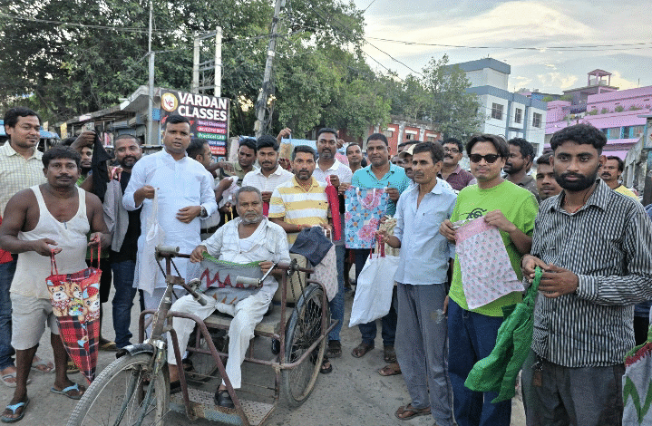 पाॅलिथिन बैग मुक्ति दिवस:चम्पामय चम्पारण एवं पाॅलिथिन को कहें ना अभियान के बैनर तले आम लोगों के बीच पर्यावरण जागरूकता हेतु वितरित किया गया कपड़े का थैला– भाजपा नेता राहुल कुमार।