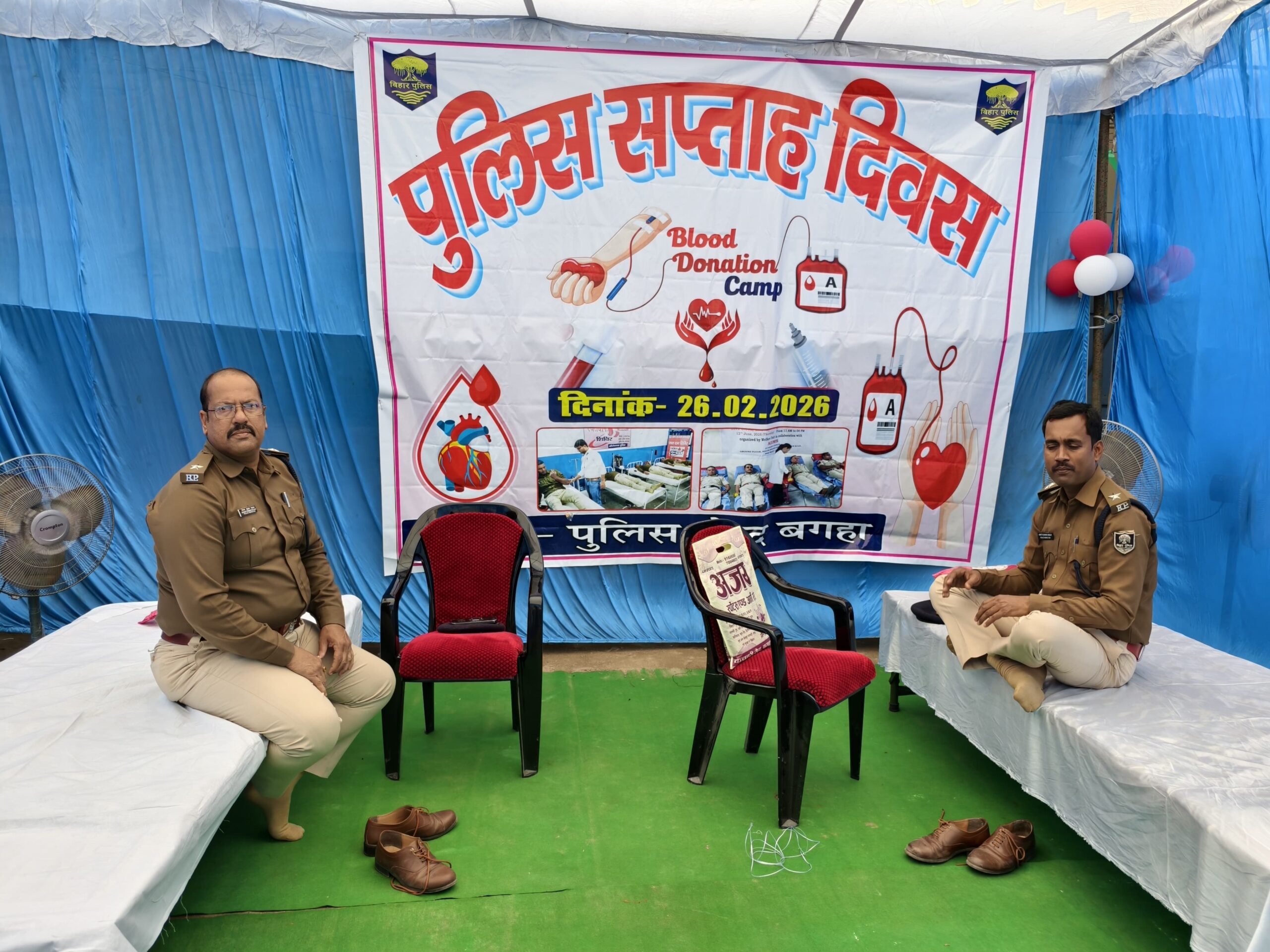 बिहार डेस्क,बगहा।बिहार पुलिस सप्ताह दिवस-2026 के अवसर पर शुक्रवार को पुलिस अधीक्षक,बगहा रामानंद कौशल के निर्देशन में पुलिस केन्द्र बगहा मे रक्तदान शिविर का आयोजन किया गया।इस अवसर पर पुलिस पदाधिकारियों एवं कर्मियों ने उत्साहपूर्ण भाग लेते हुए स्वैच्छिक रक्तदान किया। एसपी रामानंद कौशल ने बताया कि उक्त कार्यक्रम का उद्देश्य समाज के प्रति पुलिस की संवेदशीलता एवं मानवीय दायित्वों के निर्वहन प्रदर्शित करना तथा आमजना में रक्तदान के प्रति जागरूकता फैलाना था।रक्तदान शिविर में उपस्थित चिकित्कीय टीम द्वारा सभी आवश्यक स्वास्थ्य मानकों का पालन करते हुए रक्त संग्रह किया गया। एसपी ने कहा कि रक्तदान एक महादान हैं, जिससे जरूरतमंद लोगों का जीवन बचाया जा सकता हैं, और पुलिस बल सदैव समाजहित में तत्पर है।मौके पर बगहा एसडीपीओ कुमार देवेंद्र,अंचल पुलिस निरीक्षक बगहा संजय पाठक,मुख्यालय के पुलिस पदाधिकारी सहित अन्य पुलिस पदाधिकारी और पुलिसकर्मी एवं स्वास्थ्य विभाग की टीम उपस्थित थे।